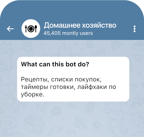 Бот помогает с кулинарией, планированием покупок и бытовыми задачами, делая домашние дела проще и приятнее.